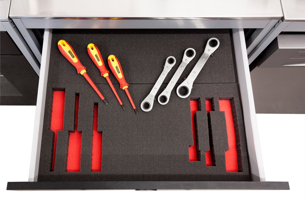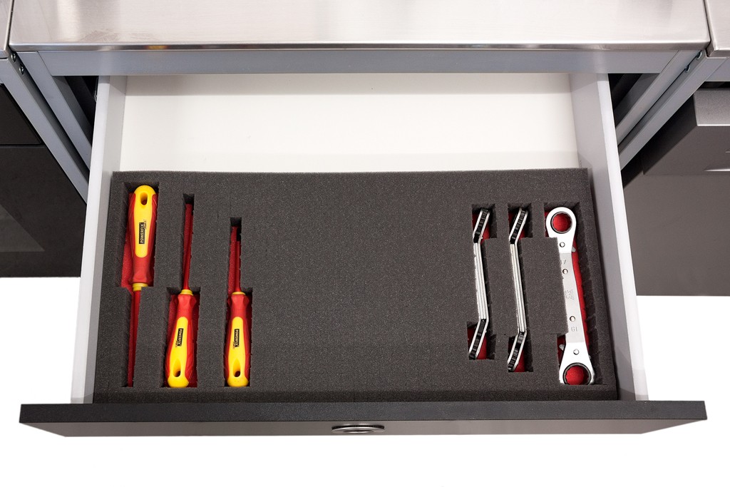 Wie man ein Shadowboard schnell und einfach selbst herstellen kann, wurde ja in einem früheren Post eingehend beschrieben ([Shadowboard selber herstellen](http://www.wuerfelschaum.de/shadowboard-selber-herstellen/)). Welchen Umfang die Werkzeugeinlage haben soll, hängt dabei maßgeblich von ihrem Lagerort ab. Neben der Unterbringung in einem Werkzeugkoffer gibt es auch die Möglichkeit mit einer größeren Rastermatte die Schubfächer in Küchen oder Werkstätten zu füllen.
